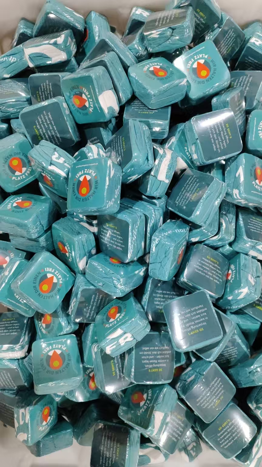 - Gepresst in individuelle Formen: z. B. Herz, Glühbirne, Tablette, Flasche, T-Shirt,rund, quadratisch, rechteckig,u. v. m.